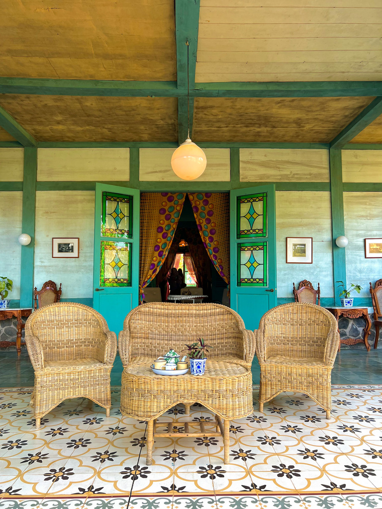 A lively outdoor living area with rattan and wooden furniture. It was taken at This Earth of Mankind movie shooting set, Gamplong Studio Alam.