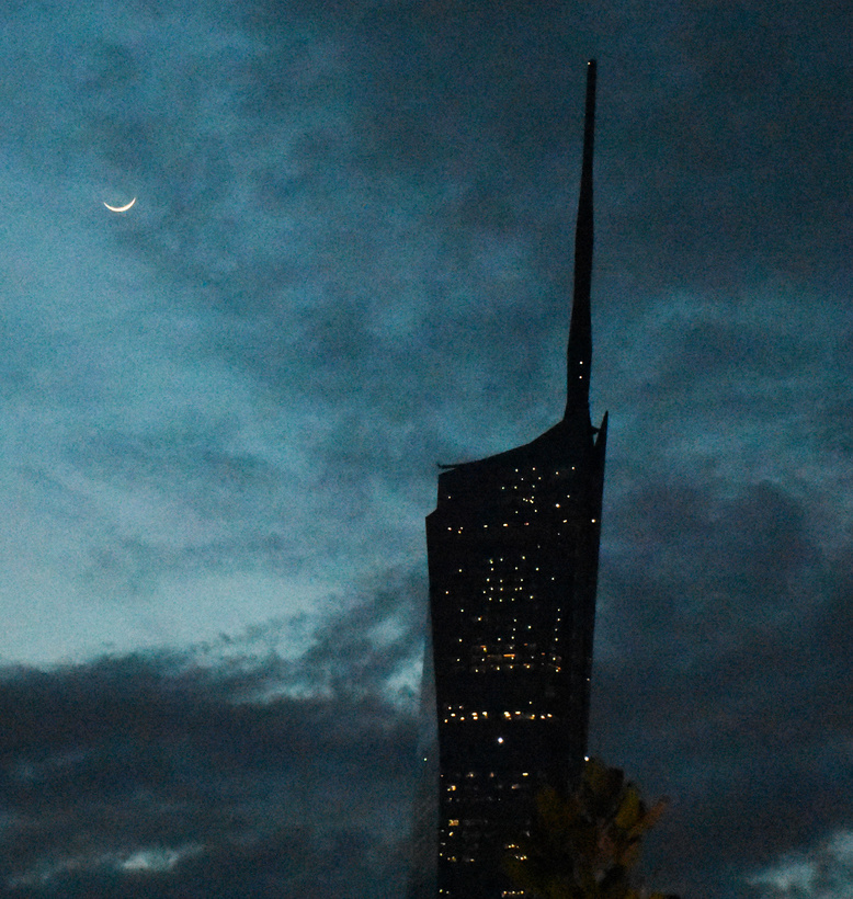 The photo was taken with a close-up shot to capture the building as well as the crescent moon in one frame by using a 75 mm lens.